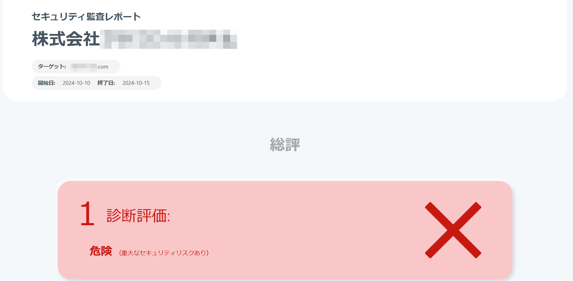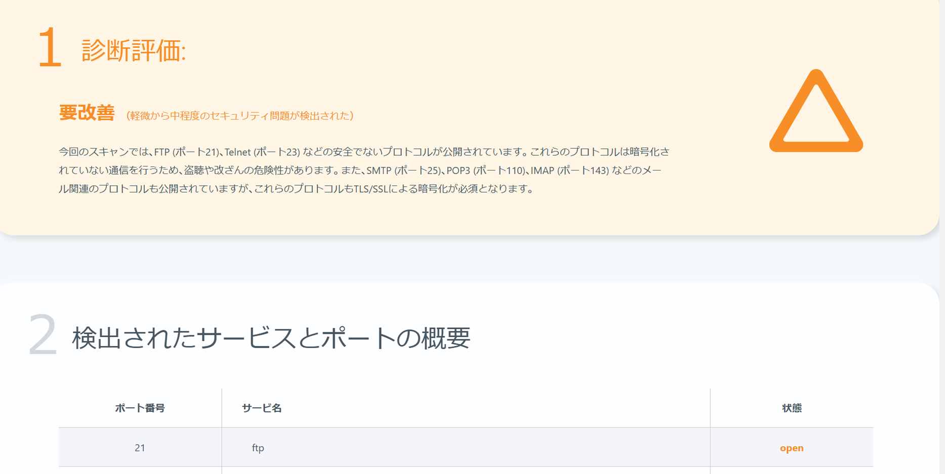 診断レポートには、対応が必要な項目と優先度が明記されています。まずは優先度の高い項目から対応し、必要があればサポートもご依頼いただけます。