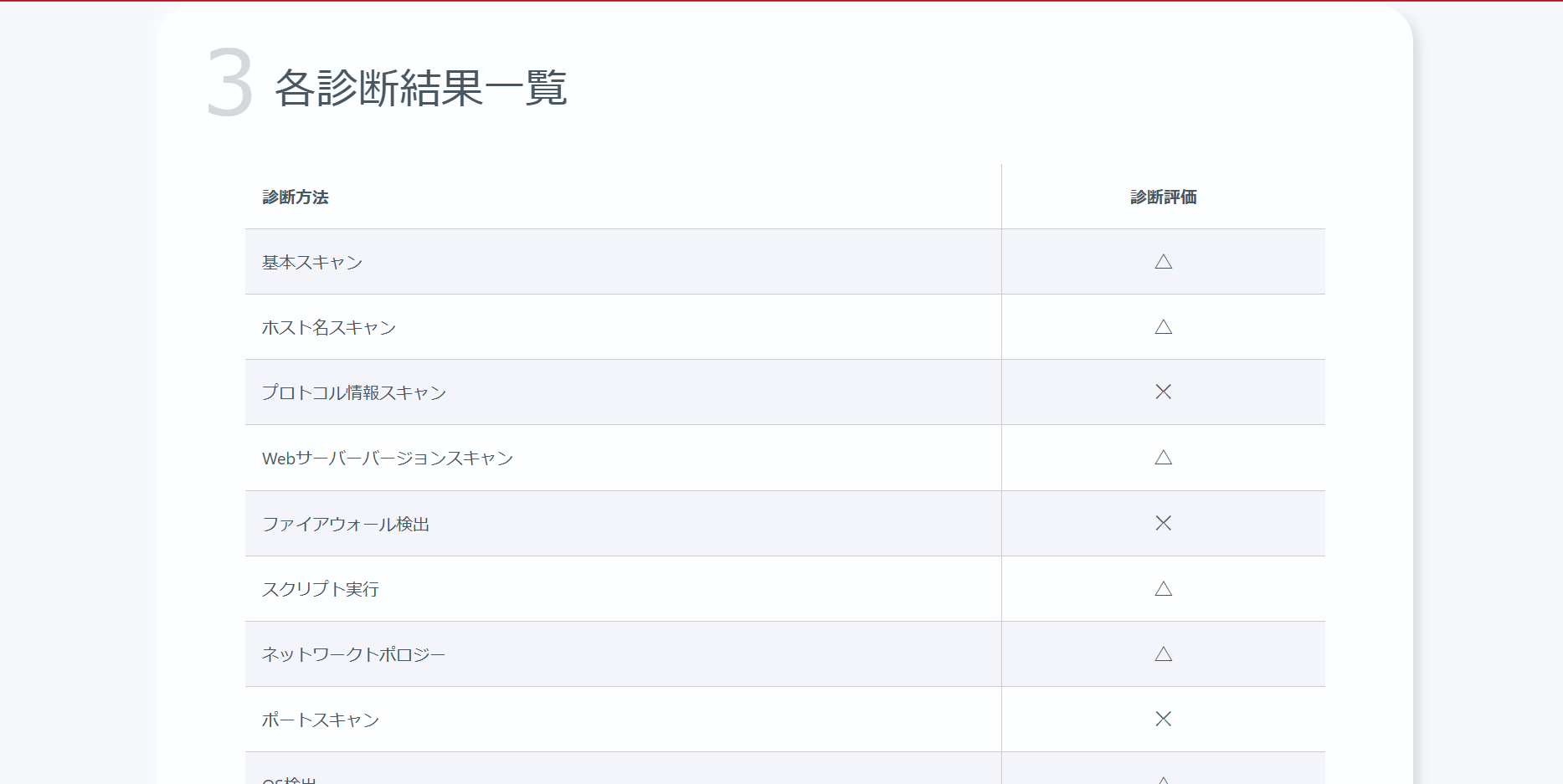 - この診断を行うことにより、お客様がご利用中のISPやホスティング業者様より不正アクセスとみなされ、ご利用中のISPやホスティング業者様より問い合わせ等が発生する可能性がございますが、弊社が不正にデータを取得することはございません。